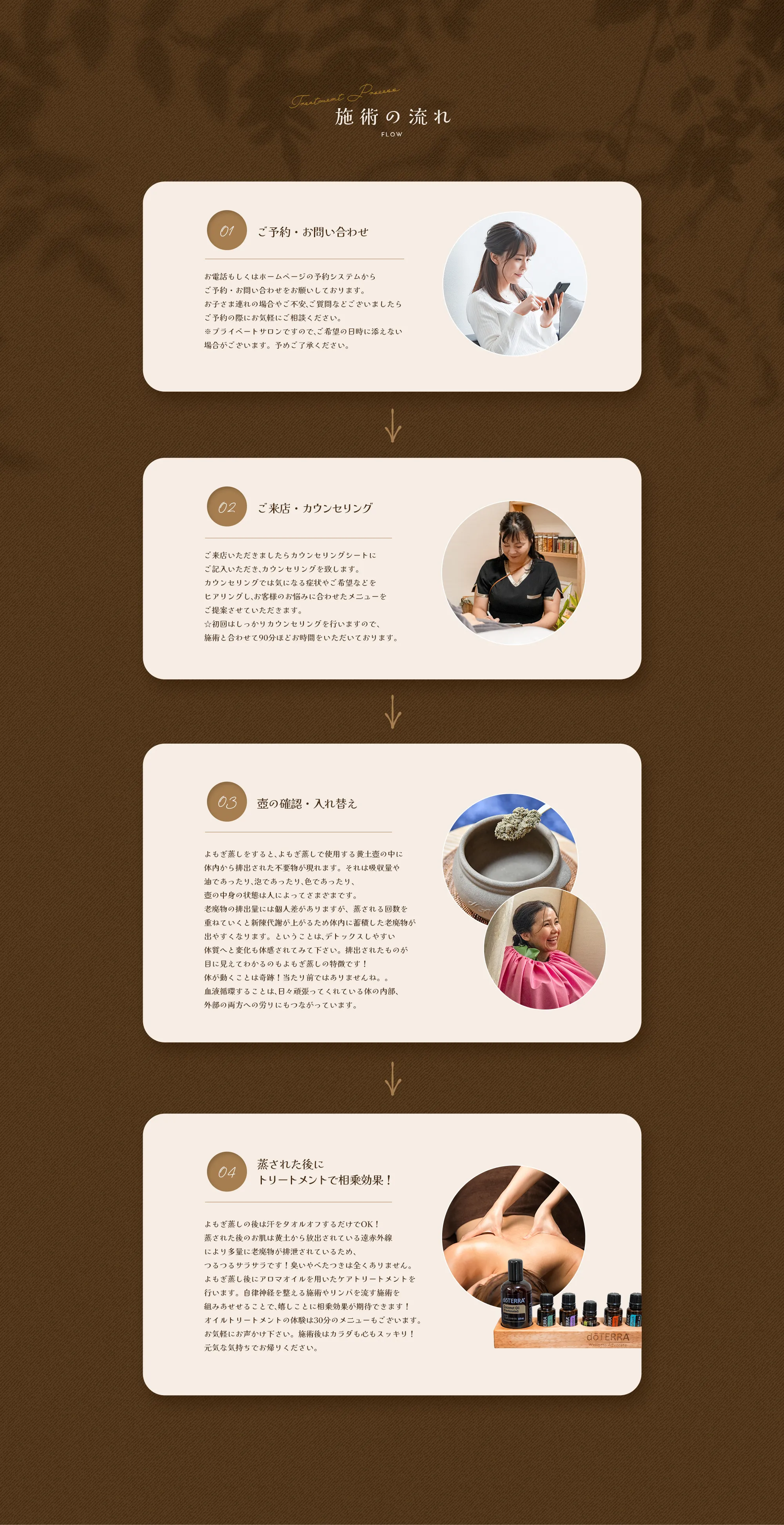 トリートメント施術前に温活としてよもぎ蒸しをで血液循環が良くなると、オイルが“より“身体の深部まで浸透し、オイルの力も”更に”パワフルに働くことができるので相乗効果が期待できます。よもぎ蒸しは体中の皮膚粘膜から薬草成分を吸収し、体内の老廃物を汗と一緒に排出してカラダをデトックスする韓国の伝統的な民間療法です。カラダの中の臓器まで温まりますし、臓器からも老廃物を排出するので新陳代謝促進や免疫力アップ、体質の改善が疲労回復につながります。継続は力!という言葉があるように、